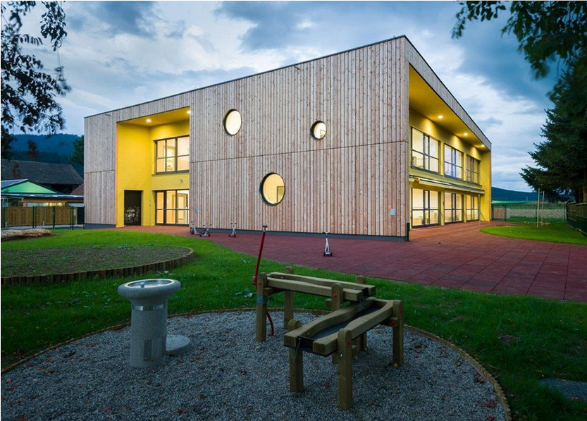 斯洛文尼亞的?martno分時幼兒園是低能耗房屋。幼兒園室內的采用木材裝飾,所有墻面的木材都是當地取材,這......