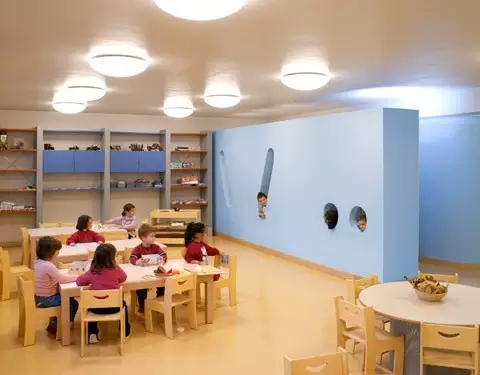 歐美國家的一些幼兒園由于在教育方式實行的是以幼兒為中心的教育手段,幼兒的活動區(qū)域具有很大的開放性,因此室內(nèi)空間多為開放性空間,同時具有更大的流通靈活性,課堂活動上有分有合,布局組合隨意。界面分隔手法奇特,半墻等半通透甚至完全通透的多種類型的隔斷,空間具有較高的層次性,界面立體性較強,整體趣生高。