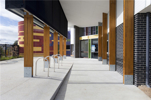 Hazel Glen兒童家庭中心處氣候比較涼爽,在Whittlesea,建筑里需要較長的采暖時間。該建筑使用了一種包含板內(nèi)液體加熱的燃?xì)庀到y(tǒng),在建筑內(nèi)可以保暖和蒸發(fā)制冷。在天氣溫暖的時候,巧妙的朝向和玻璃的陰影對維持室內(nèi)舒適溫度和采光至關(guān)重要,這得益于防止空氣泄露的雙層玻璃和嚴(yán)實的密封裝置。
