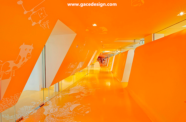 整個KU65 Kids Club的內部顏色選用來鮮亮的橙黃色與白色搭配,所有被“切開”的斷面皆為白色。桔黃色的表面上印有各種有趣的卡通圖案與涂鴉,甚至還有類似攀巖的墻壁。很難想象這里竟是一家醫療保健機構,所以項目名為KU65 Kids Club就容易理解了。幼兒園設計