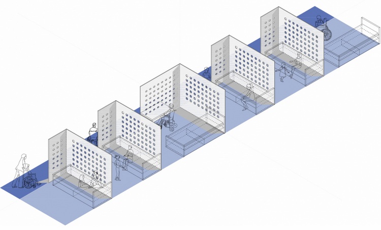 睡眠空間包含兩部分,一是隱藏空間,一是“凹處”?!半[匿處”的穿孔木制面板創(chuàng)造了獨立而且光學(xué)連續(xù)性良好的房間,而在“凹處”靠床一面的墻壁則被加厚,床深深嵌入環(huán)繞它的墻壁里,保證了在公共房間內(nèi)的隱私。