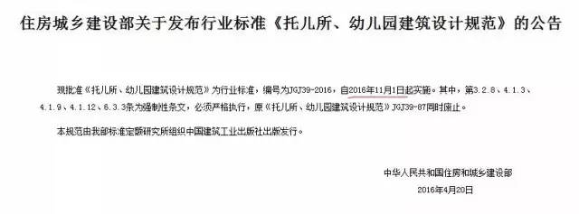 現批準《托兒所、幼兒園建筑設計規范》為行業標準,編號為JGJ 39-2016,自2016年11月1日起實施。其中,第3.2.8、4.1.3、4.1.9、4.1.12、6.3.3條為強制性條文,必須嚴格執行,原《托兒所、幼兒園建筑設計規范》JGJ 39-87同時廢止。
