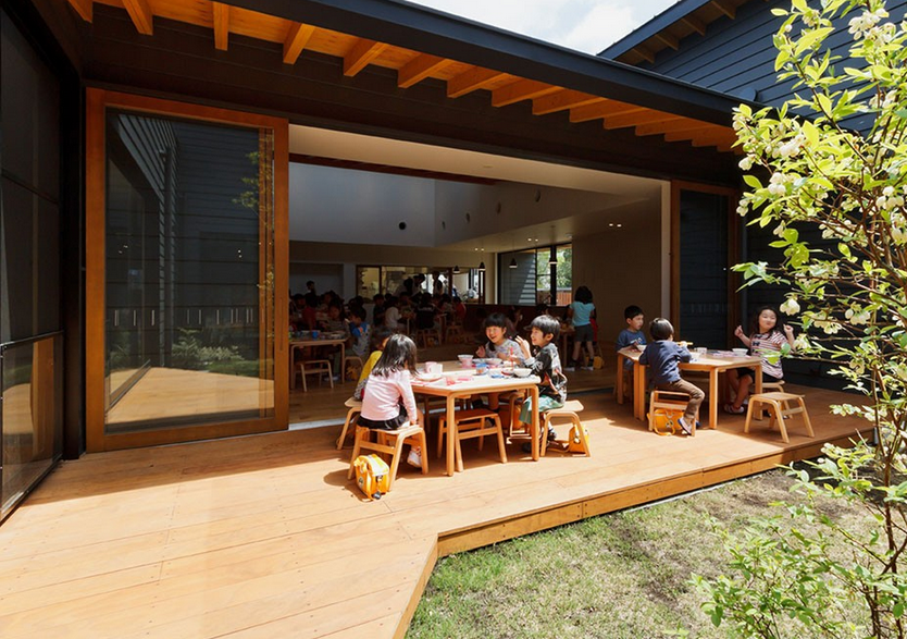 連接建筑物所產(chǎn)生的空間被用作庭院和按不同年齡段分類的花園。計(jì)劃中庭院的大小存在適當(dāng)?shù)木嚯x,使孩子們可以看到同一水平的風(fēng)景。在兒童衛(wèi)生間,面對(duì)庭院的圖畫(huà)書(shū)室、餐廳和嬰兒室,可以建立他們?cè)谏钪凶匀坏乜吹奖舜说年P(guān)系。