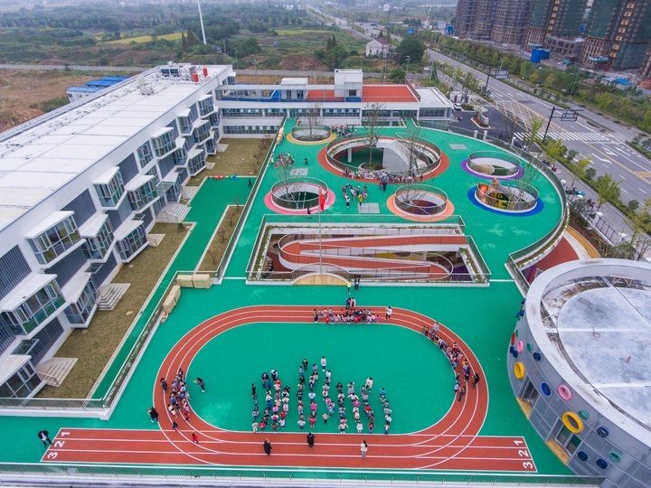 在浙江湖州長興縣龍山街道的中心幼兒園,在十月十七日正式開園,這是一個投資八千萬元占地十九畝的幼兒園,據了解這個幼兒園的設計理念是來源于日本,在日本富士有個幼兒園和空山中心幼兒園一樣都是在郊外建設的,因為土地有限但是學生們還是需要一個可以給學生運動的的操場,為了解決這個場地不足的問題所以設計師還講操場跑到設計到了屋頂,做成了一個環形結構,之所以要這樣設計是因為孩子的運動規律是特別喜歡跑圈。