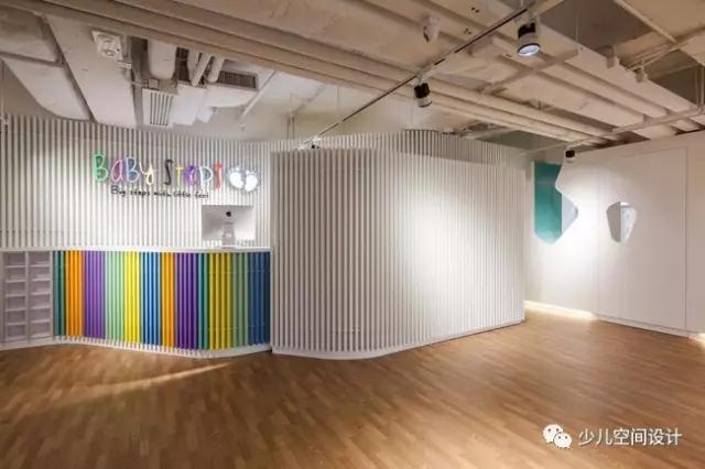 幼兒樂園的入口處設(shè)置了透明的玻璃門,純白色的金屬百葉窗,簡(jiǎn)潔利落的百葉窗顯得美觀大方。入口的一側(cè)還設(shè)有接待臺(tái),同樣是由柔和彎曲的彩色百葉窗造型設(shè)計(jì)而成。Babysteps的標(biāo)識(shí)置于接待臺(tái)后面的墻上,五彩的字體設(shè)計(jì)更顯活潑可愛。燈光打在百葉窗上形成微妙的光影,使得BabySteps產(chǎn)生了一個(gè)工藝的視覺形象。