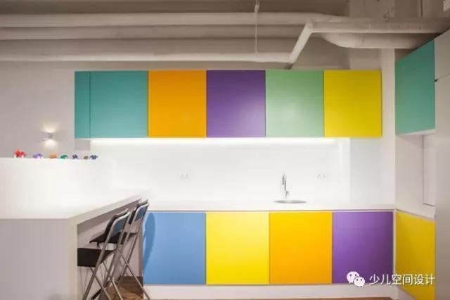 就餐區(qū)和休息區(qū)是專門為家長和老師設(shè)計(jì)的兩個(gè)區(qū)域,他們可以在這里交流溝通孩子的情況。就餐區(qū)在功能上是一個(gè)帶有多重色彩櫥柜的敞開式廚房,它這樣的設(shè)計(jì)還可以激發(fā)孩子的興趣以及異想天開的想象力。就餐區(qū)的顏色都源自Babysteps的標(biāo)識(shí)中相同的色調(diào),與幼兒樂園整體的設(shè)計(jì)在視覺上形成統(tǒng)一,同時(shí)它也與整個(gè)室內(nèi)空間微妙的單色調(diào)相互協(xié)調(diào)。