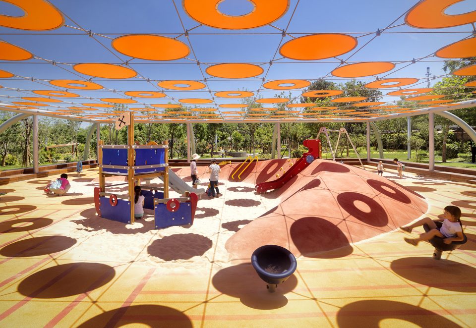 第一個游樂場是一個與景觀完美相融合的正方形區域。這個場地由木制長椅圍合成一個微微下沉的地塊空間。這種為家長提供的休憩空間也劃定了場地的界限,為孩子們創造了一個安全的游戲區,讓他們可以盡情地玩耍。為了進一步增強圍合感和保護感,橙色圓盤構成的天蓬懸浮在人們的頭頂上。這些圓盤在柔軟的游樂面上投射了一層棋盤狀的陰影,為孩子們遮擋陽光,驅逐炎熱。