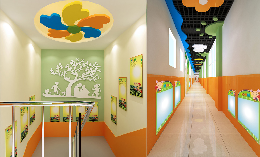 大廳頂部為雙園形黃綠套色吊頂,象征母親與幼兒,月亮與星星;大廳墻面制作一米半高的中孔文化墻,從造型孔中露出背面擺放的金魚缸,自由自在的金魚呈現(xiàn)出幼兒園生機(jī)活潑的景象。園的廊墻面布置以抽象畫或抽象作品為主,色調(diào)為黑、白、灰、橙色的搭配為主。走廊頂部安裝網(wǎng)狀鋼網(wǎng),便于吊掛裝飾物。走廊立柱以五彩或橙色為主。(幼兒園室內(nèi)設(shè)計)